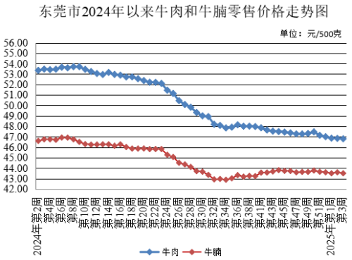 第3周,牛肉农贸市场零售均价为每500克46.80元,较上周下降0.09%。牛腩农贸市场零售均价为每500克43.50元,较上周下降0.21%。鸡肉农贸市场零售均价为每500克17.27元,较上周下降0.69%。