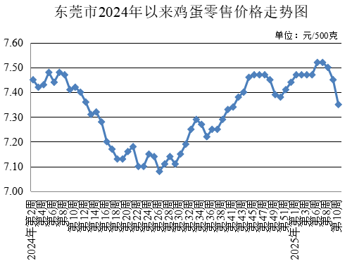 第10周,所监测的鸡蛋农贸市场零售均价为每500克7.35元,较上周下降1.34%。